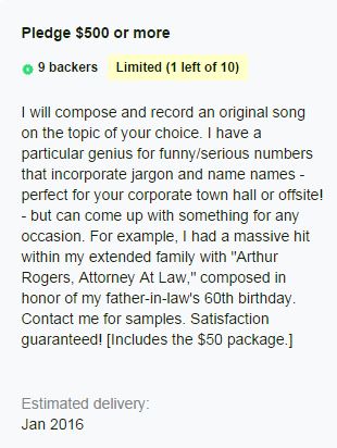 $500 seemed like a “priced to sell” contribution level, if you consider that I only wished to “sell” ten songs. And, in fact, I sold all ten, if you include the guy who missed the official Kickstarter deadline but came through later.