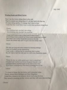 My first thought is that it that the musical setting recalls Have You Forgotten, the lead track from Songs For A Blue Guitar by one of my all-time favorite bands, Red House Painters. Could I have already heard that song? Blue Guitar came out after I finished Winding Roads, but I’d seen RHP at McCabe’s and I’m pretty sure Have You Forgotten was one of the encores. My guess is, I was trying for something similar.