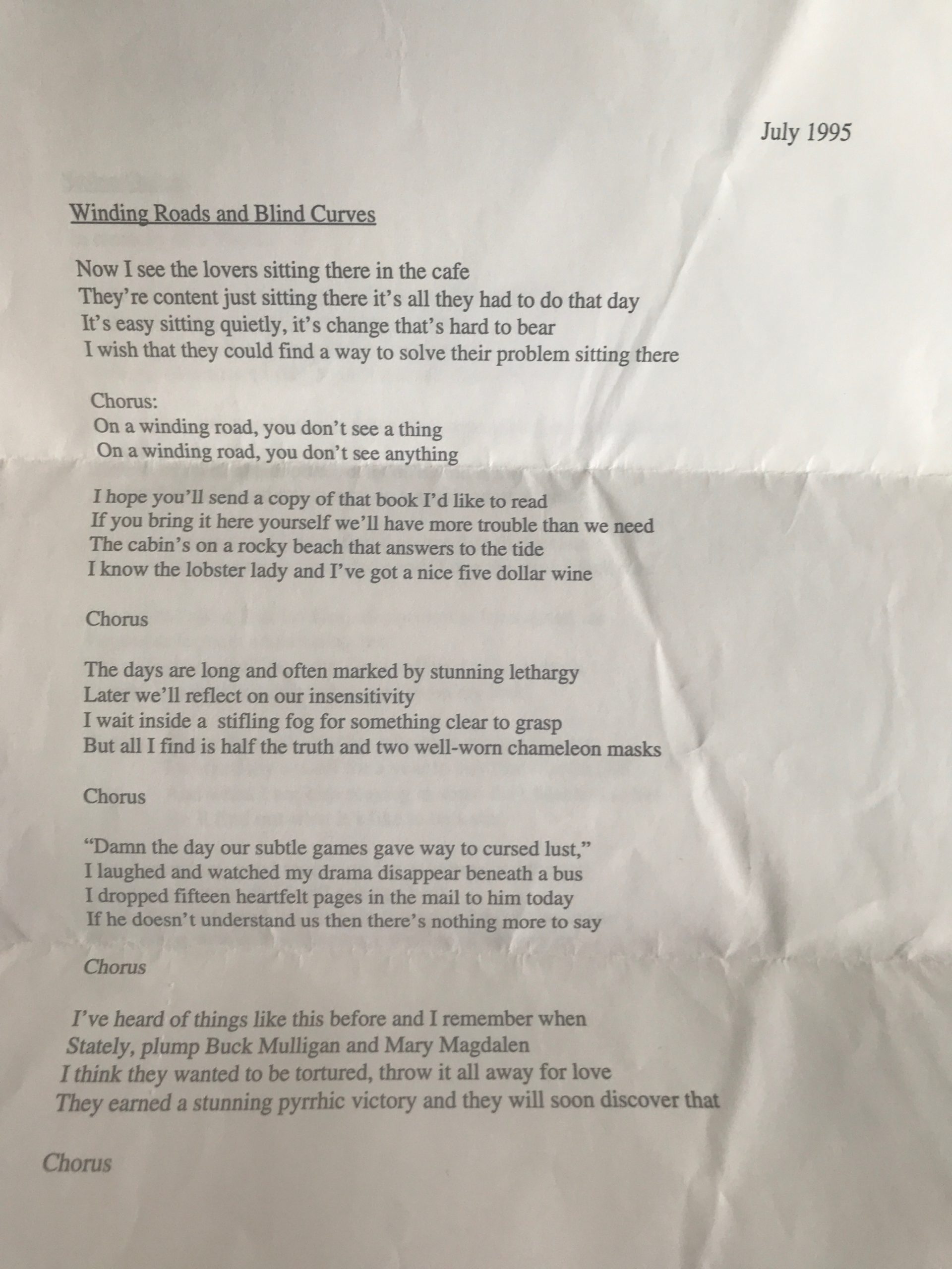 The music’s OK, but the song lacks melodic flair, and the lyrics veer between somewhat interesting (I hope you’ll send a copy of that book I’d like to read/If you bring it here yourself we’ll have more trouble than we need) and preposterous. That last verse – which quotes the first line of Ulysses, references Mary Magdalen, and declares a pyrrhic victory – is representative of my worst impulses, which tended to coalesce around bids for literary greatness. Happily, I had the sense to leave out that verse when I recorded the song.